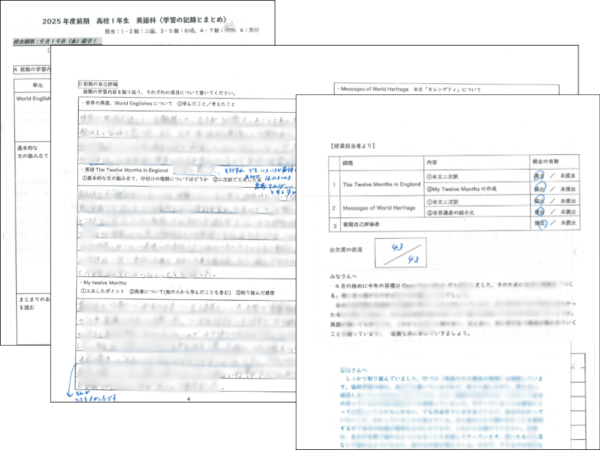 (玉木)評価の軸は、普段の授業と作品づくりです。生徒はまず自己評価表を通じて自身の学びや感想、不足している点などを記述し、これに教員が文章でコメントを返します。スピーチ原稿やポスターなどの「作品」の出来栄えや取り組み方、自己評価表の内容を通じて、生徒が授業で何を考え、何を学んだかを総合的に評価します。公式な5段階評価も行いますが、生徒に直接開示されるのは教員による詳細な文章コメントです。
