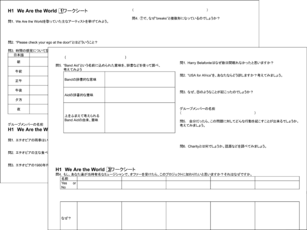 (玉木)ワークシートを作成し、学年ごとに思考を深める問いかけを工夫しています。高1では、例えば「50万人が飢餓で亡くなった」という数字について、生徒たちに自分なりの方法で実感できるよう説明させます。東京ドームの収容人数(約5万人)から「何個分に相当するか」を計算したり、身近な区の人口と比較したりする生徒もいます。また、“We Are The World”の背景を読んで「あなたなら参加しますか。別のことをしますか」と問うなど、生徒が自分ごととして捉え、実感を持って考えられるような発問を重視しています。これらの発問は、学年ごとの教員ミーティングで議論し、協力して作成しています。