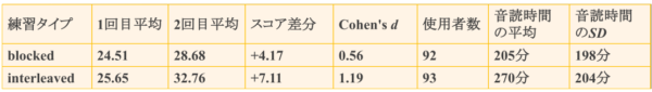 1回目から2回目にかけて、まとまり練習グループ(24.51点→28.68点)と交互練習グループ(25.65点→32.76点)のどちらも平均スコアが上昇しました。さらに、上昇の大きさ(効果量)を見ると、まとまり練習は Cohen’s d = 0.56(中程度)、交互練習は d = 1.19(大きい)で、交互練習のほうが、伸びが大きいことが分かります。したがって、音読を宿題に組み込むこと自体が学習を支えつつ、練習タイプによって伸び幅に差が生じた可能性が示唆されます。