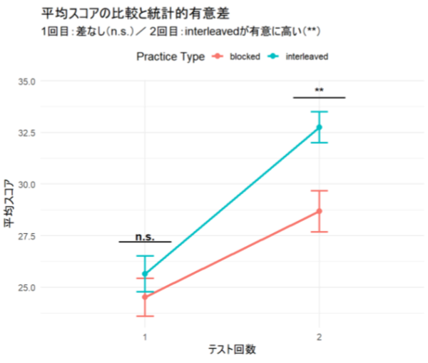 スコアの伸びは、まとまり練習が平均+4.17点、交互練習が平均+7.11点で、交互練習のほうが約3点大きく伸びました。図1のとおり、1回目では両グループの差は小さい一方、2回目では交互練習グループの平均スコアがまとまり練習グループを上回り、その差は統計的に有意でした。以上より、練習方法の違いが学習成果に関わった可能性が示唆されます。