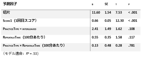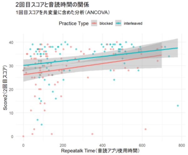 これは、練習タイプ(まとまり練習/交互練習)の違いが学習成果に関わるかを、学習前の到達度(Score1)や練習量(RepeatalkTime)と切り分けて検討した結果、交互練習の効果が「たまたま事前スコアが高かったから」あるいは「練習時間が長かったから」だけでは説明しにくいことを示しています。つまり、同程度の事前スコアと練習量を想定した場合でも、交互練習を行った学習者のほうが2回目スコアが高くなる可能性が残る、という点が今回の分析で確かめたかったポイントです。